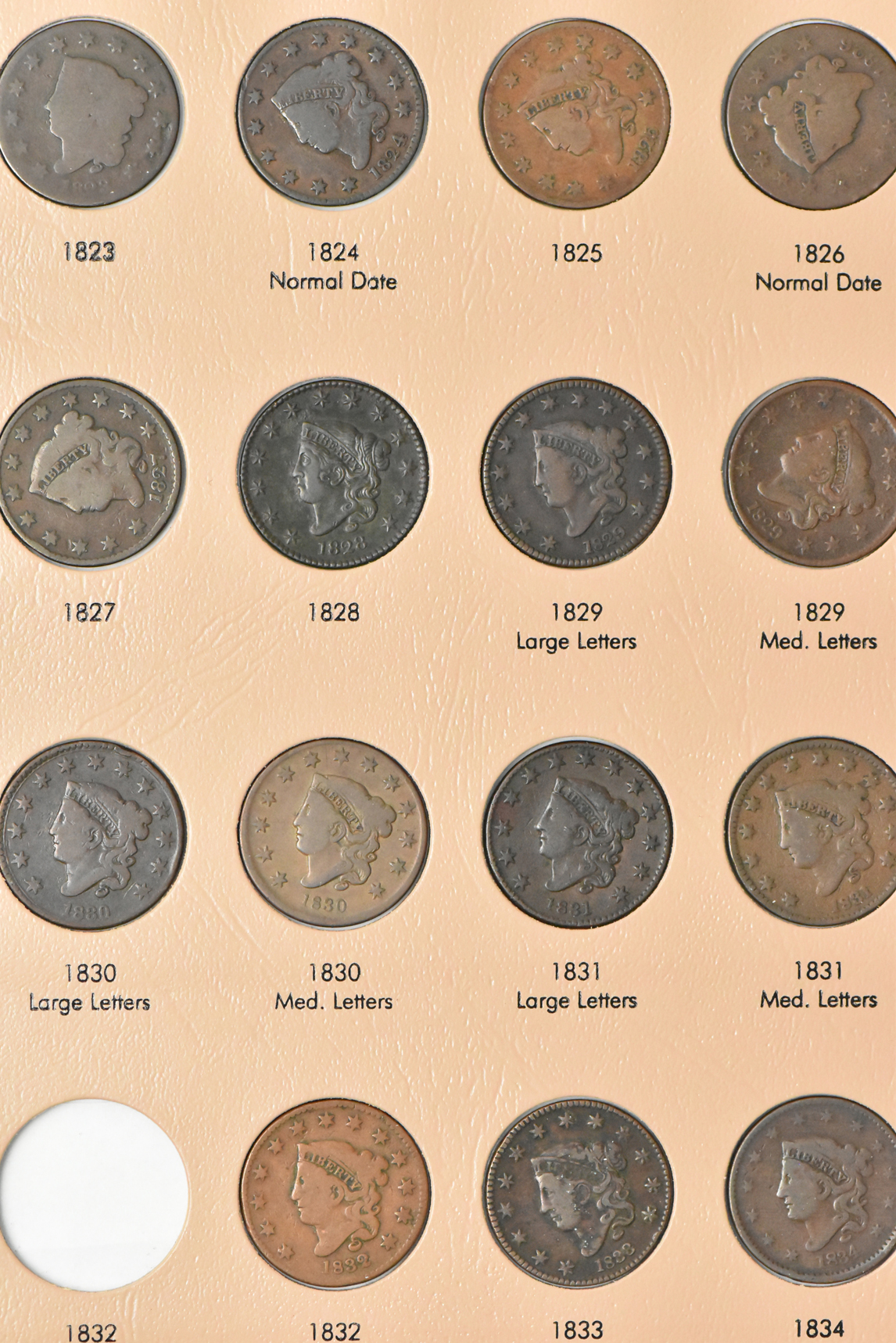 Description: Merely three pieces are missing from this collection of middle and late-date large cents, yet the final page features seven additional varieties for which there were no slots to begin with. The consignor took great pains to assemble coins with nice color, and two slab inserts have been included, namely for: 1835 lg 8 lg stars (PCGS VF-30) and 1851/81 (PCGS AU-50). A list of coins begins with 1816 Fine, 1817 13 star VG, 1818 VG, 1819 Fine, 1821 G/obverse scratched, 1822 G/corrosion, 1823 AG but choice, 1824 G, 1825 VFG, 1826 G, 1827 G, and 1828 XF details. VG coins more-or-less are 1829 lg lt, 1829 md lt, 1830 lg lt, 1830 md lt, 1831 lg lt, 1831 md lt, and 1832 md lt followed by 1833 with VF details. More VG examples follow: four 1834 major varieties and 1835 sm 8 and stars. Coins begin to have VG to Fine sharpness, mostly with attractive surfaces, starting with 1835 head of 36 to 1839 booby head. 1839 begins a run of VF to XF examples through 1842 sm dt, with a somewhat varied range of VG to XF coins dated through 1857 small and large dates. Additional examples with good or better details include 1817 15-stars, 1819/8, 1820/19, 1828 sm dt, 1819 sm dt, 1820 lg dt, and 1830 lg lt. 77 coins total.