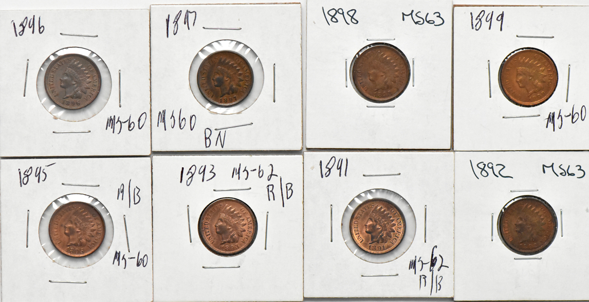 Description: Collector grade examples are readily noticed from start to finish with regards to this incredible run of Indian cents that span from 1880 through 1908. Included in this wonderful assortment are the following issues: an 1880 (BU), an 1881 (BU+), an 1882 (BU), an 1883 (BU+), an 1884 (BU), an 1885 (BU+), an 1886 Type 1 (BU++), an 1887 (AU++), an 1888 (BU), an 1889 (BU), an 1890 (AU, cleaned), an 1891 (BU++), an 1892 (BU), an 1893 (BU+), an 1895 (BU+), an 1896 (BU), an 1897 (AU), an 1898 (BU++), an 1899 (BU, light clean), a 1900 (BU++), a 1901 (Gem BU), a 1902 (AU+), a 1903 (AU++), a 1904 (BU++), a 1905 (AU++), a 1906 (Gem BU), a 1907 (BU++), and a 1908 (BU). This lot presents a tremendous opportunity for anyone attempting to collect a raw Indian cent set in loftier grades (ck)!