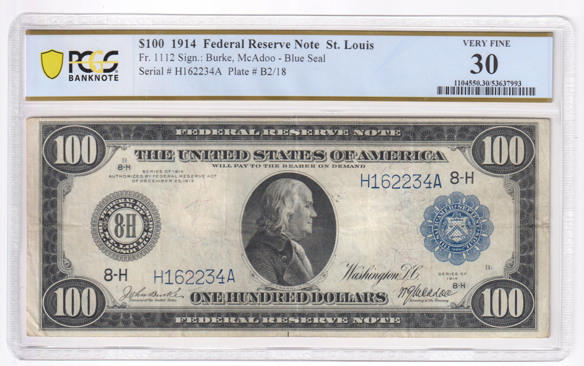 Lot Title: 1914 $100 St. Louis Blue Seal Fr# 1112 - PCGS VF-30/pinholes