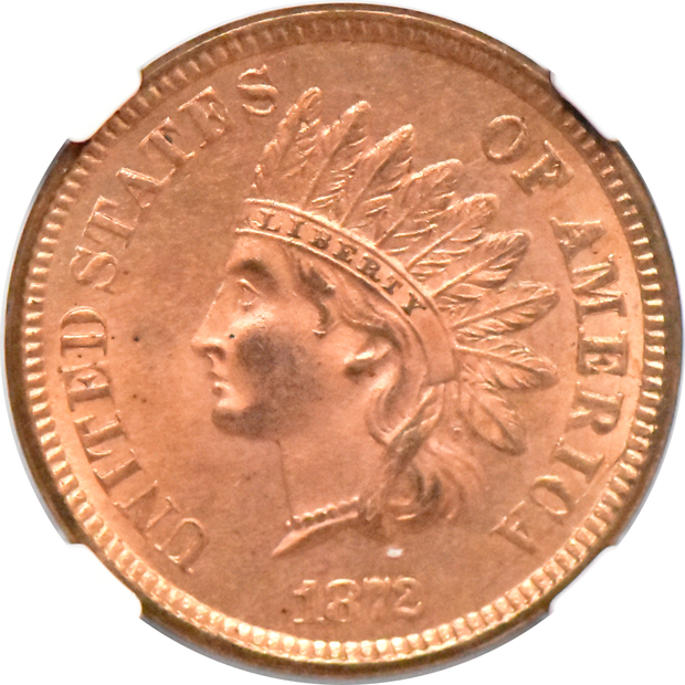 Description: 5 graded MS-65 RD, 1 higher at NGC. Snow-5a (we believe), bold N reverse, repunched 72 in date. This coin should hardly exist since Richard Snow, the foremost authority, has stated that 1872 is the single most difficult Indian cent to find with full mint red color in gem condition. Due to many being melted in contemporary times, the relatively large mintage of 4-million is misleading -- anyone who has ever assembled a high grade set of Indian cents know that 1872 is one of the stoppers. Surprisingly intense red luster spins around the obverse of this example and mellows only at isolated areas of high relief, while the reverse sees just slight greying on additional highpoint details.