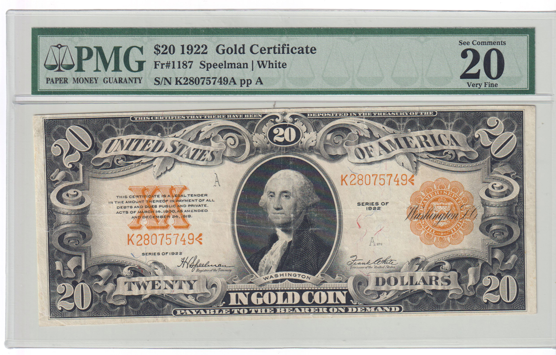 1907 $10 Fr# 1172 VF-30/damaged surface on the back, and a 1922 $20 Fr# 1187 VF-20/minor tear