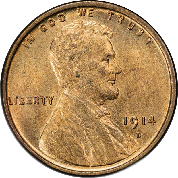 Description: Though more than twice as many 1914-D Lincons were produced to the 1909-S V.D.B. cent, less than half the population exists in PCGS MS-64 RB in the former. Ash brown devices on obverse are illuminated by a underlying brightness, making details sharp and easily discernable. Subtle chocolatey striationns adorn the reverse, dominated by a richer coppery redness throughout.