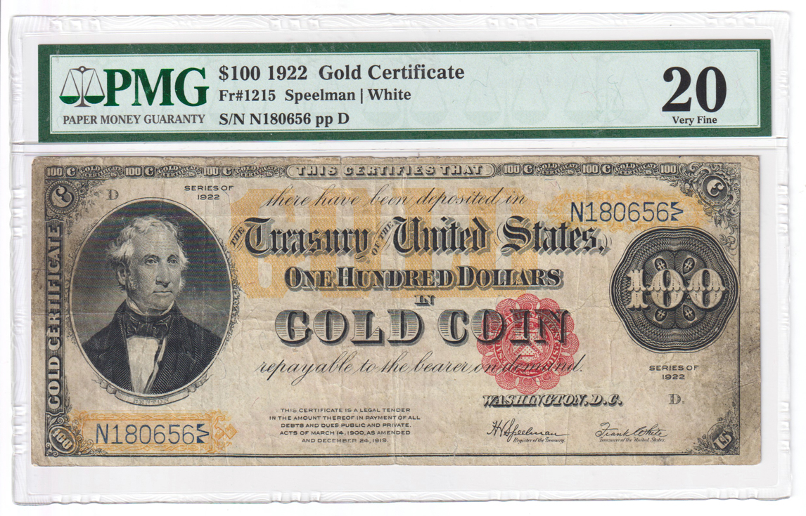 Lot Title: 1922 $100 Fr# 1215 - PMG VF-20/tear repairs