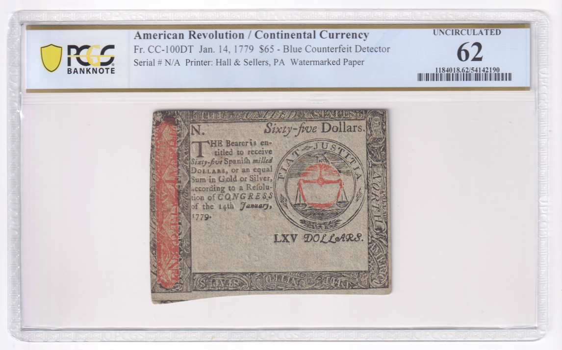Lot Title: January 14, 1779 $65 Fr# CC-100DT - PCGS CU-62