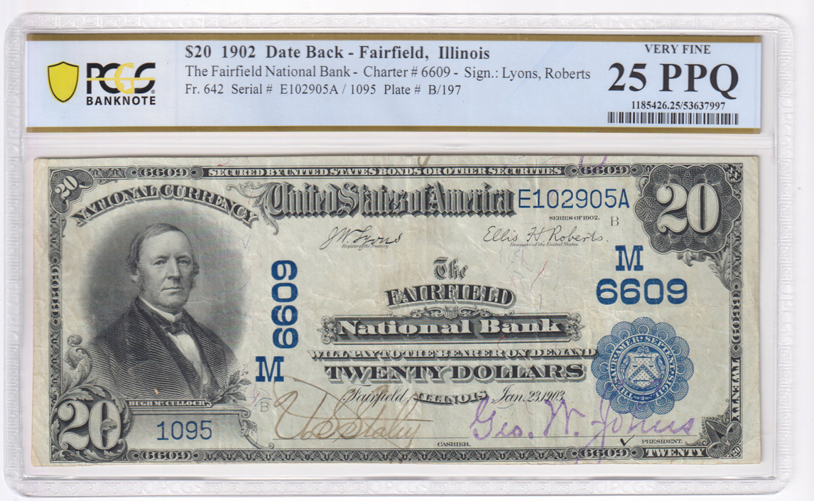 1902 $20 Blue Seal Date Back - Fairfield, IL Charter #6609 - PCGS VF-25 PPQ
