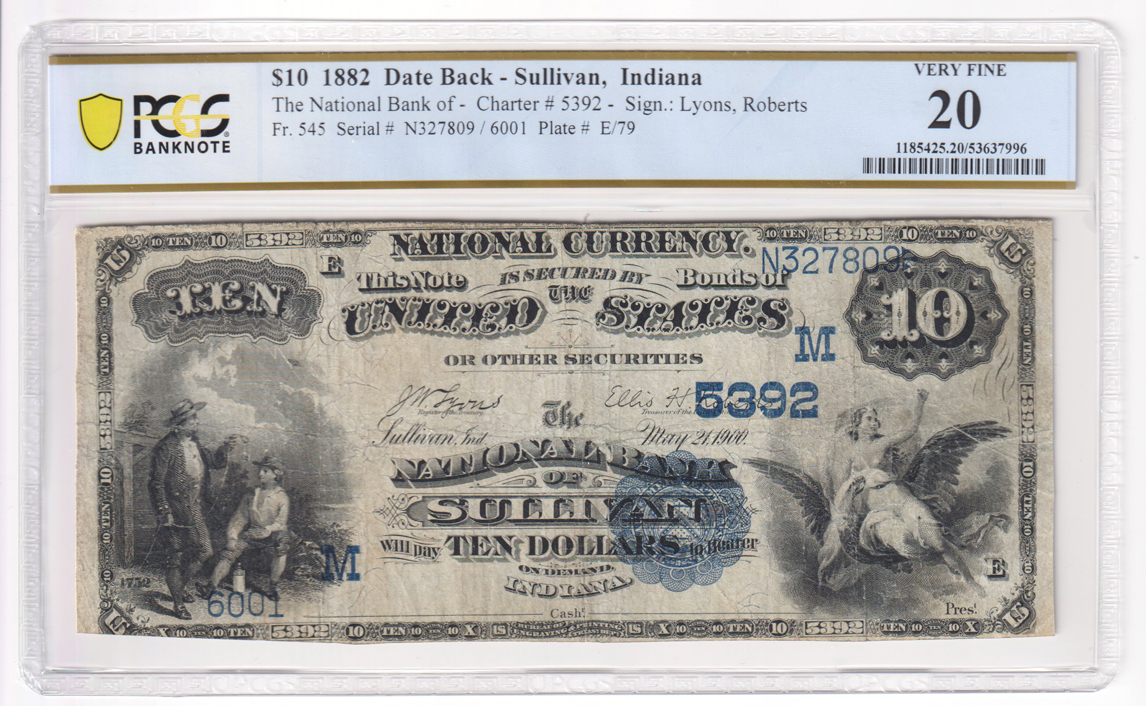 Lot Title: 1882 $10 Date Back - Sullivan, IN Charter #5392 - PCGS VF-20/bank signatures faded/minor internal tear/pinholes
