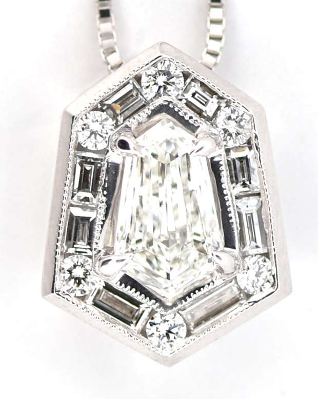 Description: You don’t see kite shape diamonds every day! This pendant was made around this 1.00 ct. modified kite step cut diamond measuring 8.93x5.61x2.79mm, VS2 clarity, H color, excellent polish, very good symmetry, no fluorescence, GIA Report #2486083173 with .45 cttw of baguette diamonds and .22 cttw of round diamonds, SI clarity, G-H color on a 14K white gold .95mm 20” box chain. Dimensions .60” x .50”, 4.1 dwt.