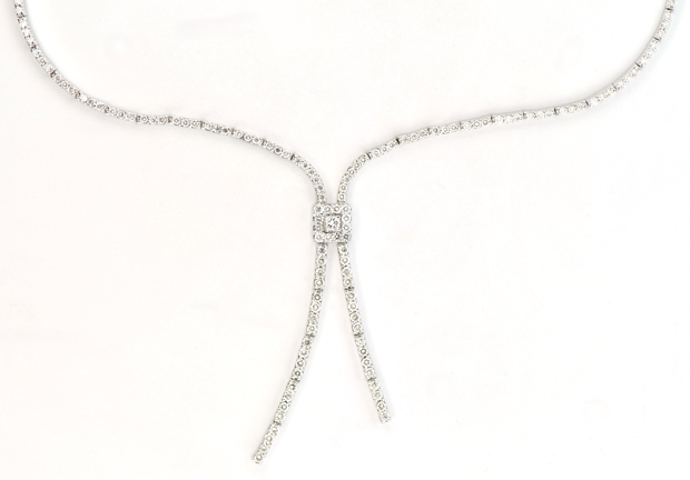 Description: A dazzling 14K white gold necklace that is literally dripping with diamonds! There is approximately 3.50 cttw of round brilliant cut diamonds, SI clarity, H-I color arranged on a lariat style necklace with white gold links completing the piece behind the neck. Length (excluding the drop) 16”, 8.7 dwt.
