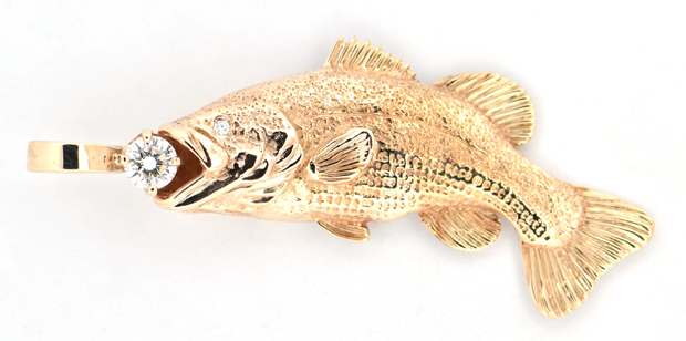 Description: This unique pendant depicts a life-like largemouth bass about to devour a round brilliant diamond weighing an estimated .35 ct., I1 clarity, I color. The fish is engraved to perfection with a tiny diamond accent for an eye. Dimensions 2” x .75”, 4.9 dwt.