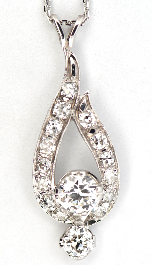 Description: A symbol of romance and affection, this diamond flame pendant is crafted of 14K white gold. At the center, an approximate .85 ct. old European cut round diamond sparkles along with an estimated .25ct old European cut at the bottom with more small round diamonds surrounding the two. The piece is suspended from a 14K 18” cable chain that secures with a lobster clasp. Dimensions: 1.25 x .50”, 2.4 dwt.