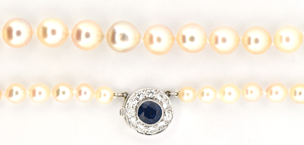 Description: A glamorous strand of graduated pearls ranging from 4.94mm to 9.82mm containing 64 near round and semi-baroque Akoya pearls with a light cream color and pink and green overtones, GIA Report #5232639040. The necklace is completed with a fancy diamond and sapphire clasp that can be worn in the front or back and has a halo of old cut round diamonds weighing approximately 1.00 cttw, SI clarity, I color, around a round brilliant natural blue sapphire from Cambodia with no indications of heating but has been clarity enhanced measuring 7.00 x 7.10mm, GIA Report #6233639033.