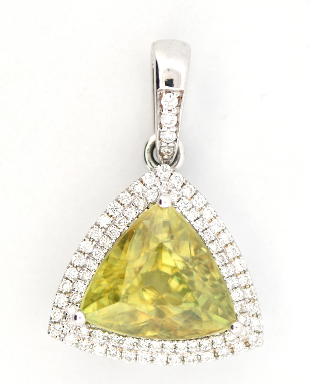 Description: This lovely pendant features a 3.10 ct. trillion sphene with a mesmerizing greenish-yellow color surrounded by a double halo of round brilliant diamonds weighing an estimated .75 cttw, SI clarity, I color. It should be noted that while extremely gorgeous, sphene is a softer mineral of very high refraction and it does take special care. You should not ever place it in ultrasonic cleaner or any other type of vibration and should just be cleaned with soap and water. Dimensions .75” x .55”, 2.3 dwt.