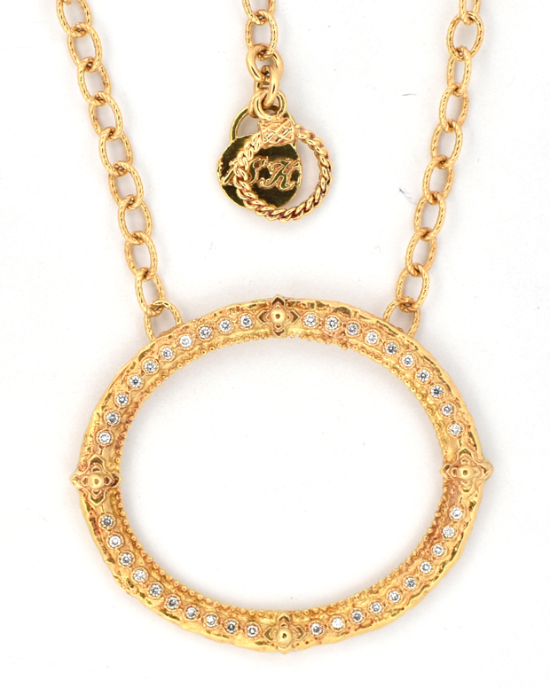 Description: A designer style necklace with an oval pendant attached to a texture gold link chain. The pendant has a row of bezel set round diamonds weighing approximately .35 cttw, SI clarity, G-H color and is fashioned with the same texture gold design as the chain. Length 15”, 7.0 dwt.