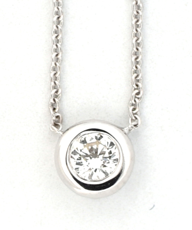 Description: An on-trend diamond bezel necklace made by Robert Coin with the signature ruby on the back and an approximate .20 ct. round brilliant diamond, VS clarity, G color. Length Adjustable 16”-18”, 1.4 dwt.