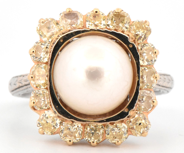 Description: This unique pearl ring features a halo of cushion cut fancy light yellow diamonds weighing an estimated 2.00 cttw, SI2-I1 clarity set in a yellow gold top to help enhance their color. The pearl measures 9mm and the shank has a nice engraved design throughout. Ring size 5.75, 5.4 dwt.