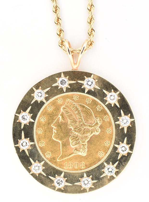 Description: A one-of-a-kind custom-made coin bezel with 12 round brilliant diamonds weighing nearly 2.00 cttw, SI clarity, I color with star designs around them set on a thick gold bezel with a 1898 $20 Liberty Gold Coin hanging from a 3mm diamond cut rope chain. Length 22”, 45.6 dwt.