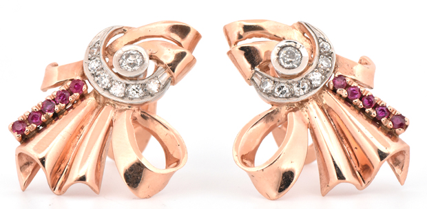 Description: In a true "left and right" design, these Retro earrings will definitely make a statement! The gemstones include diamonds and synthetic rubies. In each earring, there are seven old cut round diamonds weighing an estimated .35 cttw, SI clarity, J-K color and five pinkish-red rubies - set in platinum. There are nice omega style clips on the back. Dimensions: 1-5/16" x 1", 10.1 dwt.