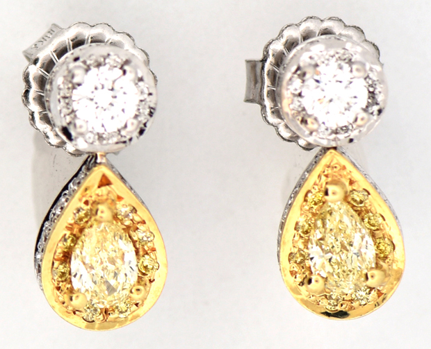 Description: A fancy pair of diamond dangles featuring fancy light-yellow pear brilliant diamonds surrounded with what appear to be artificially irradiated fancy yellow diamonds set in a yellow gold halo. The top portion of the earrings has round diamond also set in halos. The estimated total carat weight for all of the diamonds is 1.50 cttw, SI clarity. Chic and timeless, this pair of earrings adds an effortless finishing touch. Dimensions: 0.65” x 0.25”, 3.2 dwt.