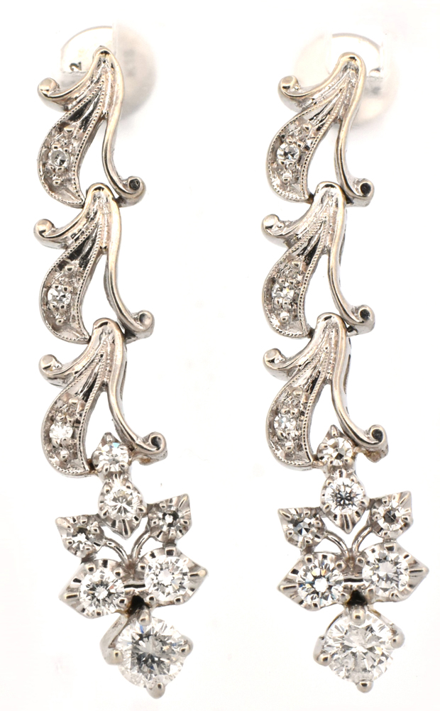 Description: Beautifully made earrings that appear to be comprised of old watch links with a custom-made diamond cluster at each end. There is approximately 1.00 cttw in round diamonds, SI2-I1 clarity, I-J color. Dimensions 1.5” x .30”, 5.0 dwt.