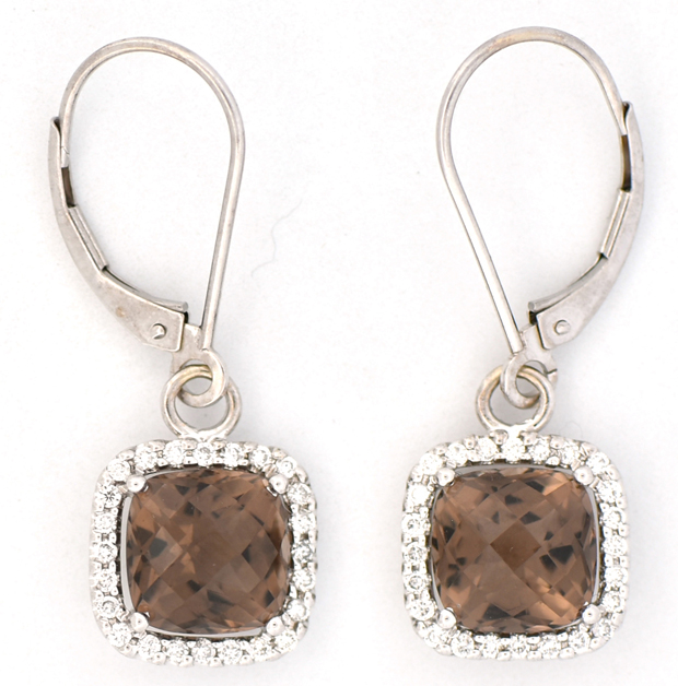 Description: Simply elegant and crafted with precision, these earrings feature a striking 8mm cushion cut faceted brown smoky quartz, surrounded by a delicate halo of brilliant cut round diamonds weighing an estimated .40 cttw, SI clarity, H color. The dangles hang from lever-backs. Dimensions: 1.25 x 0.50”, 2.5 dwt.