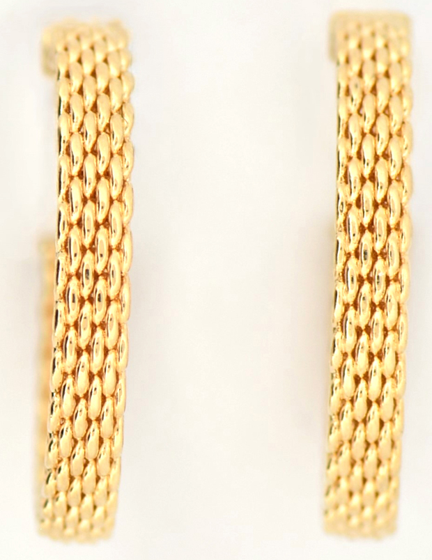 Description: These timeless 18K yellow gold 3.7mm mesh hoop earrings by Tiffany & Co. feature a fashionable woven design. They offer a touch of elegance that transitions effortlessly from day to night. Dimensions 1” x 1”, 5.6 dwt.