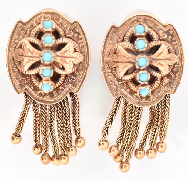 Description: Antique Victorian 14K yellow gold post earrings that feature five turquoise cabs down the center of each with tassel dangles on the bottoms. Excellent condition. Dimensions: .75” x 1.35”, 8.8 dwt.