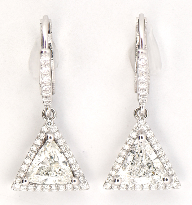 Description: These elegant diamond dangle earrings have a 1.06 ct. modified triangular brilliant measuring 7.30x7.83x3.70mm, SI2 clarity, I color, very good polish, very good symmetry, faint fluorescence, GIA Report #5231004179 and a 1.02 ct. modified triangular brilliant measuring 7.55x8.17x3.12mm, SI2 clarity, H color, very good polish, very good symmetry, no fluorescence, GIA Report #2235577332. Both center diamonds are surrounded by a halo of round brilliant diamonds weighing altogether .48 cttw, SI clarity, G-H color. There are heavy white gold lever-back closures to complete the earrings. Dimensions 1” x .50”, 2.8 dwt.