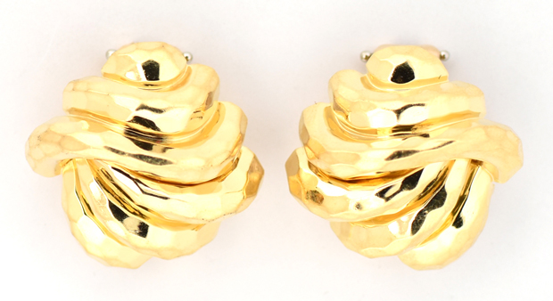 Description: Crafted in 18K yellow gold, these classic Henry Dunay clip-on earrings have a hammered gold design and heavy omega style clip-back. Dimensions .75” x .75”, 10.9 dwt.