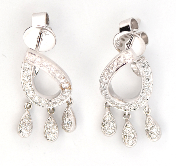 Description: These swirly chandelier dangle earrings contain approximately .50 cttw in round brilliant diamonds, SI clarity, G-H color. The design wraps slightly behind the earlobe and creates a very elegant look when worn! Dimensions .75" x .50", 3.3 dwt.