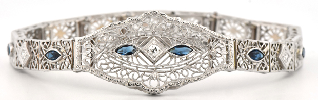 Description: This delicate 14K white gold bracelet with diamond and sapphire accents, secured with a safety chain. There are three round single cut diamonds weighing approximately .12 cttwt and six small marquise-cut synthetic sapphires featured in an intricate filagree pattern. One sapphire is chipped and a couple others have heavy scratches but this piece still absolutely beautiful. Length 5.75”, 5.8 dwt.