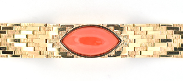 Description: A converted Lucien Piccard watch band with a lovely coral cab in a marquise shape set where the watch face once was. The band is a mixture of high polish and brushed gold links and an adjustable clasp. Length 6.75”, 19.9 dwt.