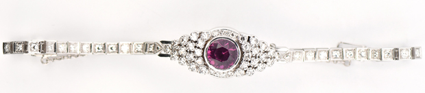 Description: An upcycled ladies wristwatch with a 9mm round garnet with a purplish-red color and an array of single cut round diamonds clustered on either side weighing approximately 1.25 cttw, SI clarity, I color. The diamonds are on the links as well, so this piece is extra sparkly! Length 7”, 10.2 dwt.