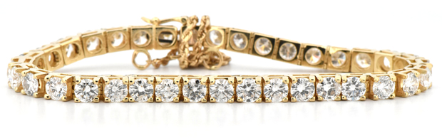 Description: A sparkling classic tennis bracelet with 36 round brilliant diamonds that are individually set with four prongs each and weigh 10.80 cttw, SI2-I1 clarity. There is a safety chain attached to the bracelet. Length 7”, 12.5 dwt.