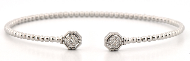 Description: From the Bujukan line by Gabriel and Co., this beaded flexible bangle has small diamond clusters on the ends with approximately .20 cttw, SI clarity, H-I color. The piece is marked with the serial number 1653065 and #6.5. Dimensions 2.5” x 2.1”, 3.2 dwt.