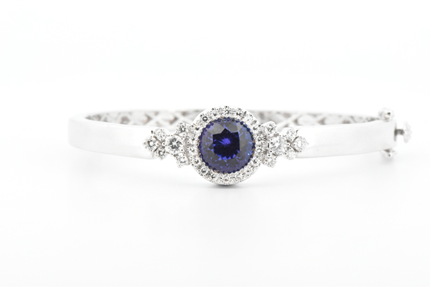 Description: A classic bangle bracelet with an old Bulova watch head where the face has been replaced with a 4.37 ct. round tanzanite with a striking purplish-blue color surrounded with a halo and diamond clusters with round diamonds weighing approximately .75 cttw, SI clarity, H color. Dimensions 2.5” x 2.1”, 12.1 dwt.