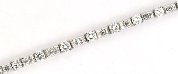 Description: This attractive diamond bracelet has baguette diamond links mixed with individually set round brilliant cut diamonds, altogether weighing an estimated 3.50 cttw, SI clarity, I color. Length 6.5”, 11.9 dwt.