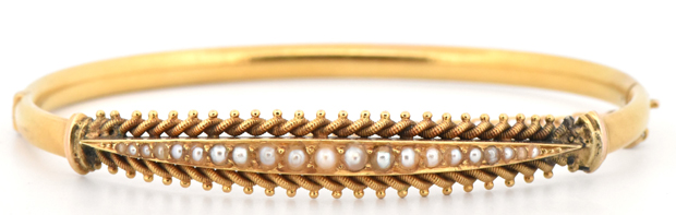Description: Own a blast from the past with this Victorian bangle with small seed pearl accents lines in a row across the top with a twisted cable design on either side. There is a safety chain attached. Dimensions 2.4” x 2.1”, 6.0 dwt.