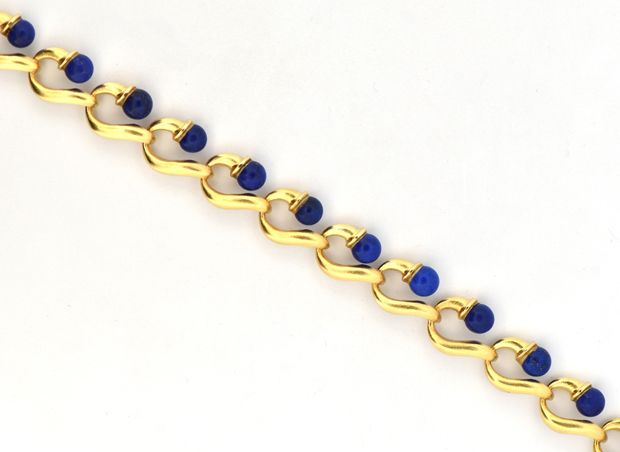 Description: This fancy link bracelet has hook-style links with 5mm round blue lapis beads on each one. The gold has a brushed finish and the clasp has a figure-eight safety attachment. Length 8”, 14.1 dwt.