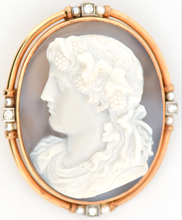 Description: Check out this antique 14K gold hardstone agate, diamond and natural pearl cameo pin! This piece features a carved “follower of Bacchus” (the God of Wine) to the front. She is a lovely lady with bunches of grapes in her hair. Outstanding condition with no chips/cracks in the agate. If you are looking for one piece of cameo jewelry to pass onto family members, this is it! Dimensions 2” x 1.75”, 30.5 dwt.