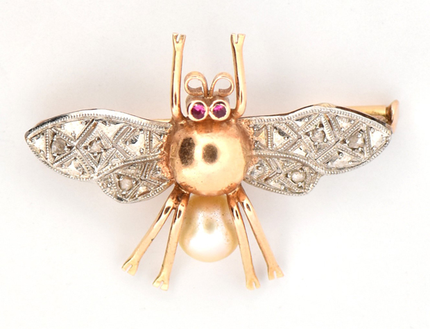 Description: Here we have an Edwardian pin with rose cut diamond embellished wings. The eyes of the fly/moth feature a pair of faceted 1mm red ruby accents while the back section of the body is a 5.5mm x 7mm natural pearl. Trombone clasp closure. Possibly French in origin and excellent condition. Dimensions: 1.5” x 1.2”, 3.5 dwt.