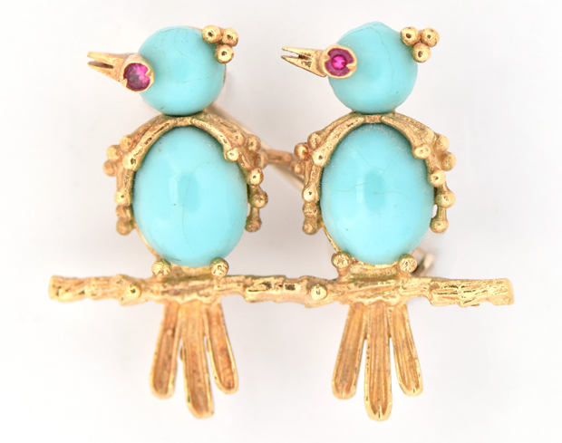 Description: A mid-century 18K yellow gold pin crafted in Europe. The brooch depicts a pair of lovebirds sitting on a branch. With bodies of Persian turquoise and eyes that are set with faceted rubies accents, these cuties are a must have! There is a trombone clasp closure. Excellent condition. Dimensions: 1.1” x 1.25”, 5.4 dwt.