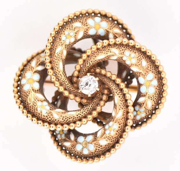 Description: From Krementz, an antique Victorian “love knot” pin featuring a design of blue/white enamel (some enamel is missing) forget-me-nots and an old cut round diamond at the center weighing an estimated .10 ct. SI clarity, I color with a simple “c” clasp closure. Dimensions: 0.8” x 0.8”, 3.1 dwt.
