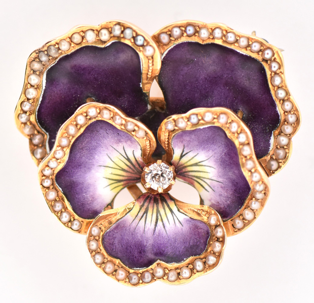 Description: Pense a moi! Think of me - French Victorian parlance for gifting a lady one with a precious token of love! The pansy has always been a well-received gift item at any time of the year and this Christmas, maybe some lucky lady will receive this beauty! The front design of this brooch displays a beautiful purple/white rendition of a pansy with natural split pearls (none missing and no replacements) all around the edges; a single faceted old cut diamond at the center weighing approximately .15 ct. SI clarity, I color which adds an additional sparkle to the piece. The enamel is in excellent condition. Dimensions: 1.65" x 1.25", 8.9 dwt.