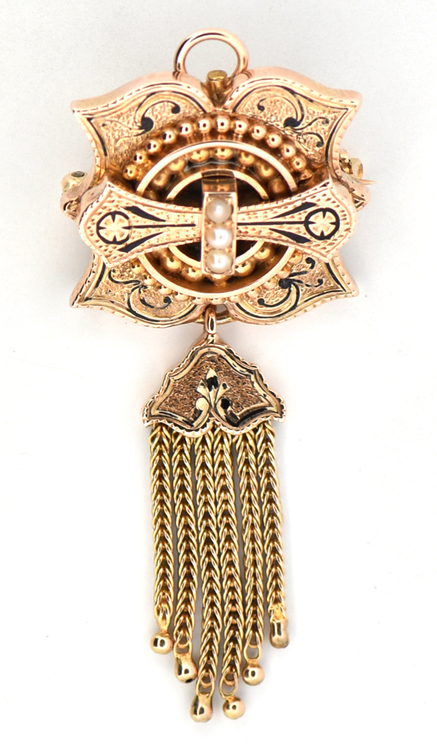 Description: A lovely Victorian tassel style pin/pendant combo with small pearl accents and black enamel detailing (some chipped and needs to be repaired) with engraving and beading as well. The back does have some lead solder marks but they are totally unseen when worn. Dimensions 2” x .90”, 5.6 dwt.