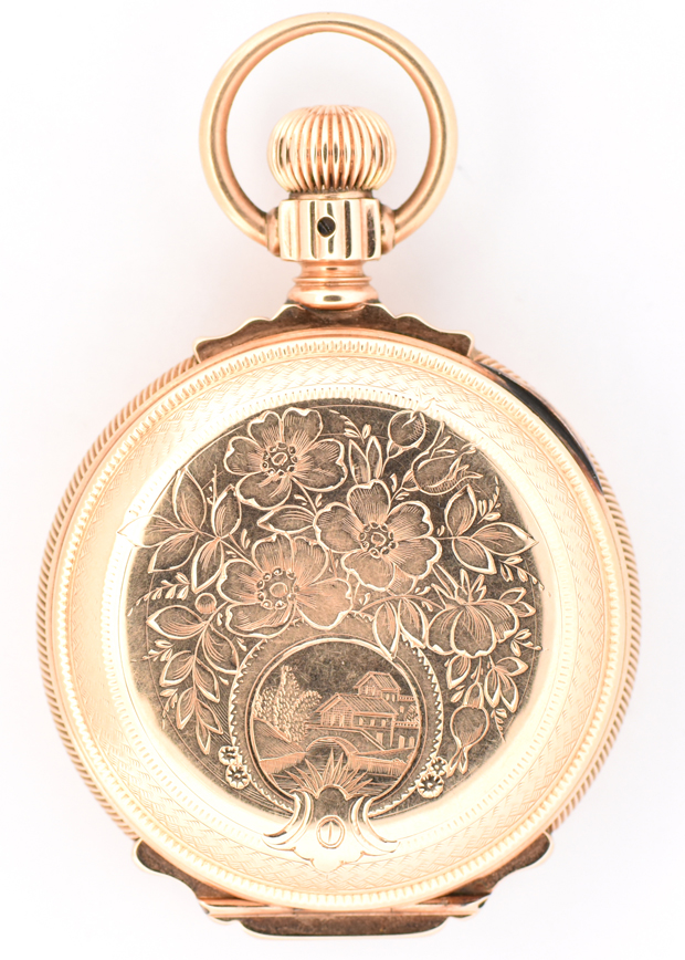 Description: This 18-size pocket watch has a 17-jewel movement by Rockford Watch Co., Rockford, Illinois. The case features beautiful floral etching on the front and back. Engraved inside on the back lid is “From K. to Ed G. 12-25-1886”. Winds, sets, and runs. 90.7 dwt.