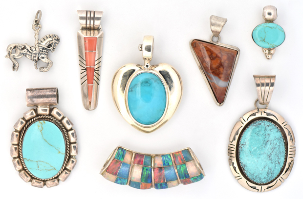 Description: Seventeen sterling silver pendants make up this lot. Here you will find a splendid display of pendants, with a majority of them containing stones. The total weight with stones is 7.00 troy ounces.