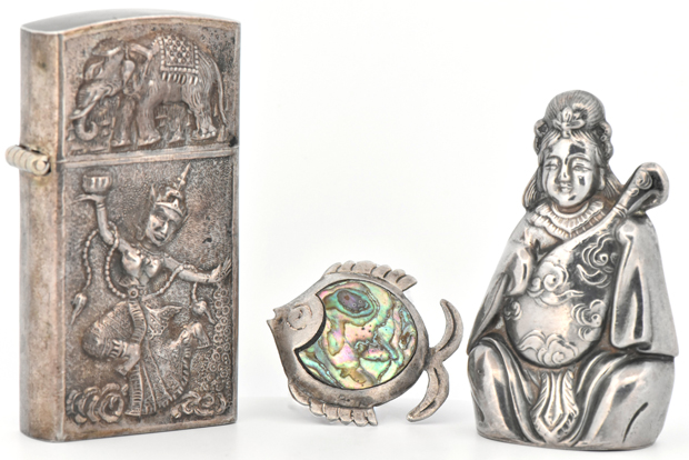 Description: This lot contains a total of 25 sterling silver items. There are 22 pins, a lighter, a vintage pill box and a vintage Japanese salt/pepper shaker that is sadly missing a mate. The total weight with stones is 9.39 troy ounces.