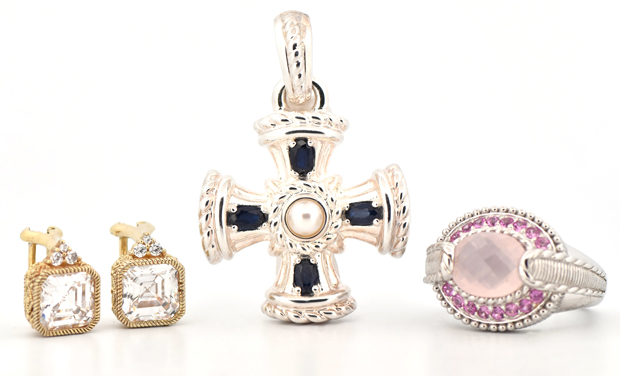 Description: This lot features eight chic sterling silver Judith Ripka pieces. There is one bracelet, one pair of earrings, three pendants and three rings. 3.39 troy ounces.