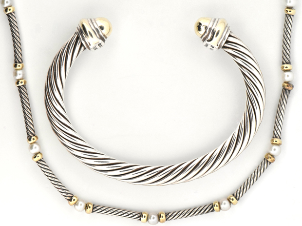 Description: In this lot you will find two snazzy David Yurman pieces. The first is a sterling silver and 14K 7mm cable classic gold dome cuff. Note: The dome ends are dented. The second is a 15” sterling silver and 14K Hampton pearl choker necklace. 2.10 troy ounces.