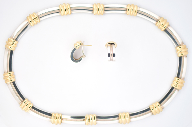 Description: Here you will find two Tiffany & Co. pieces. This is a matching Tiffany & Co. set that includes a 16” sterling silver and 18K 1995 Atlas bar link station necklace and a pair of earrings. This set comes with a velvet Tiffany and Co. folder. 2.55 troy ounces.